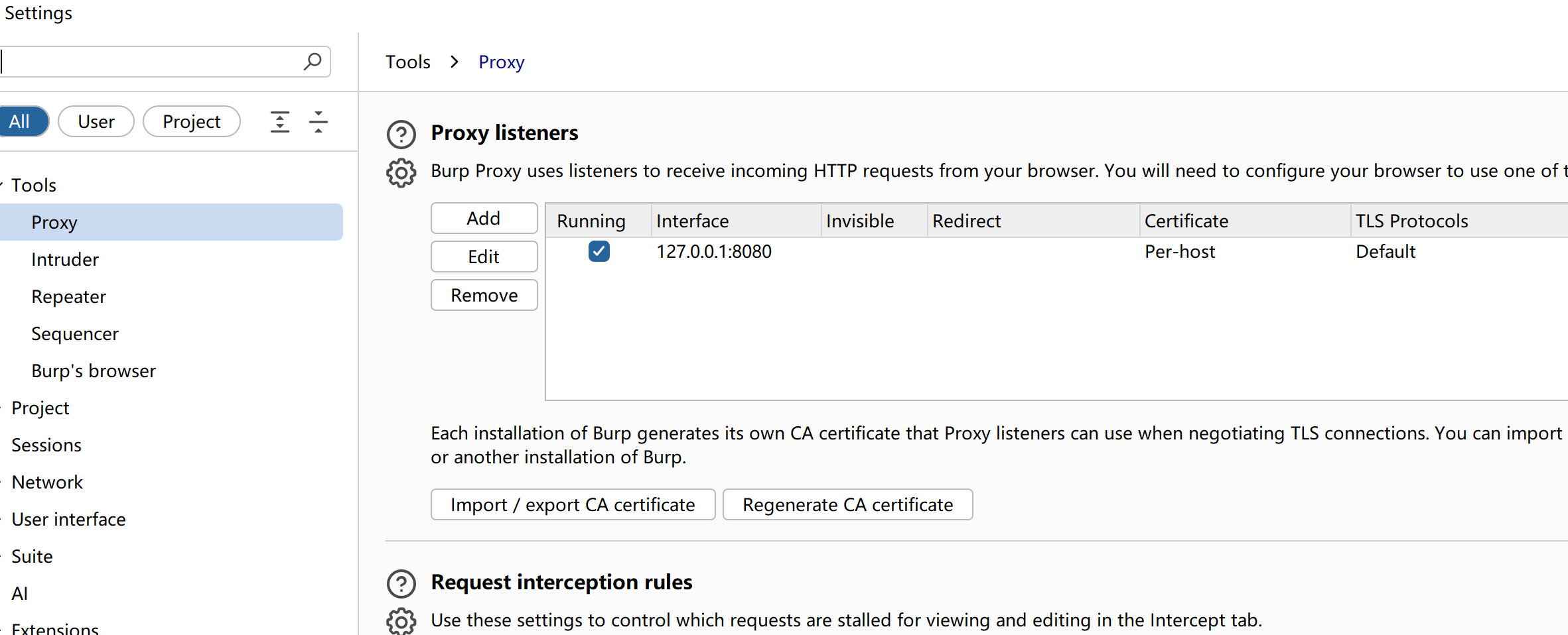 设置burpsuite代理ip端口 点击proxy选项==>接着点击proxy settings