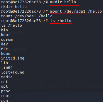 mount /dev/sda1 /hello ---挂载(umount /dev/sda1 取消挂载)