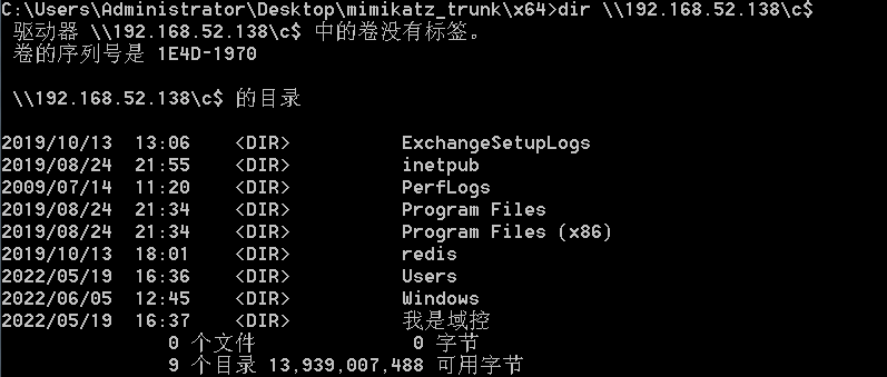 dir \\192.168.52.138\c$ #查看连接域内ip的c盘文件夹