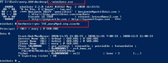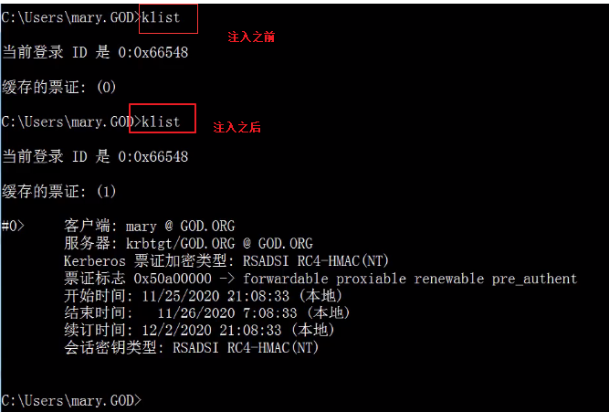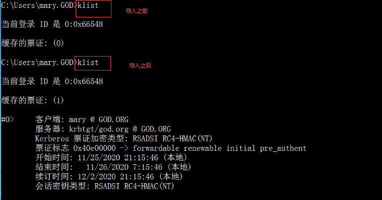 kerberos::ptt TGT_mary@GOD.ORG_krbtgt~god.org@GOD.ORG.kirbi //导入票据
