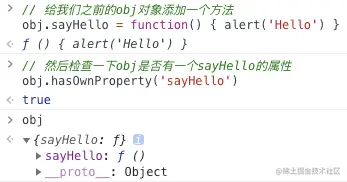 可以看到obj上确实多了一个sayHello的属性,值为一个函数,但是问题来了,obj上面并没有hasOwnProperty这个方法,为什么我们可以调用呢?这就引出了 原型。