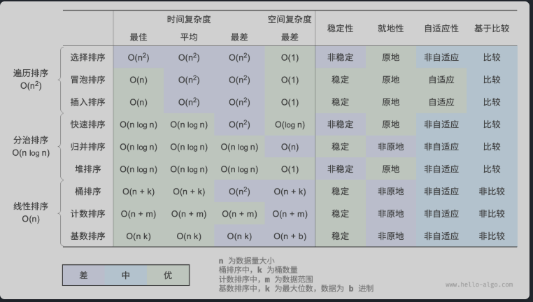 对比了主流排序算法的效率、稳定性、就地性和自适应性等。