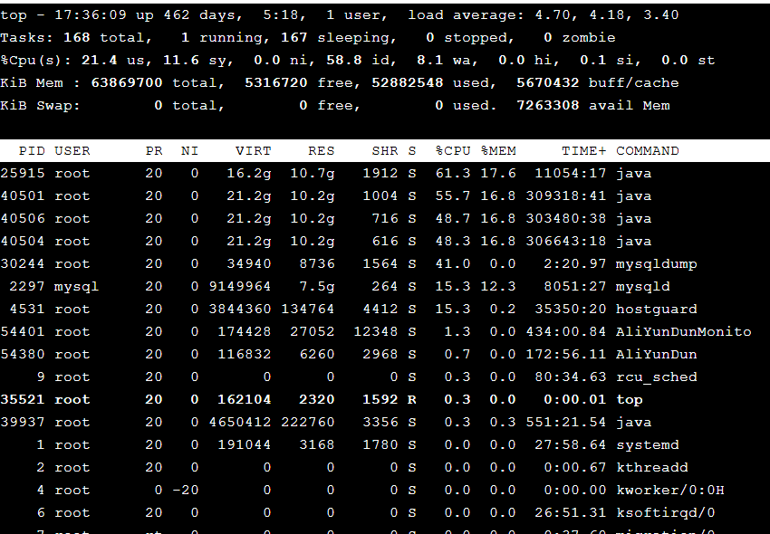 total = used + free + buff/cache63869700 (total) = 5316720 (free) + 52882548 (used) + 5670432 (buff/cache)