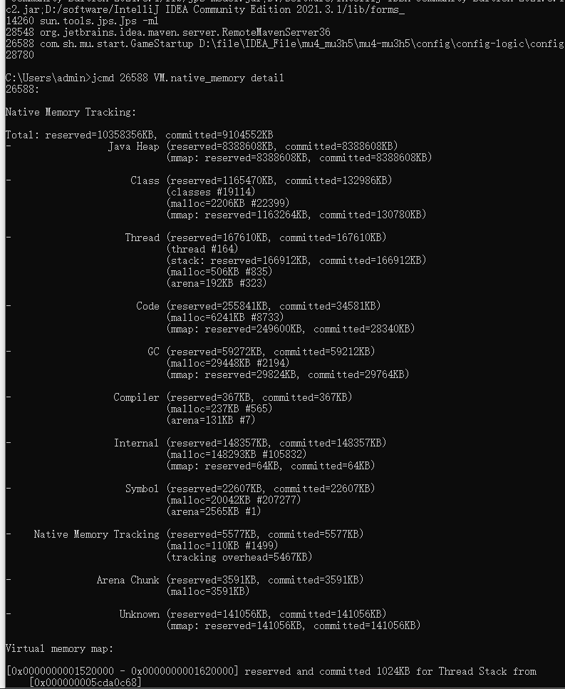 - GC: reserved=1.5GB, committed=1GB # 垃圾回收器占用