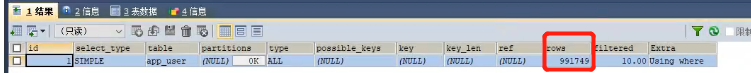 -- 下图执行结果,rows = 991749,执行99万行才找到它