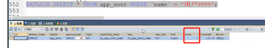 -- 下图执行结果,rows = 1,执行1行即找到它
