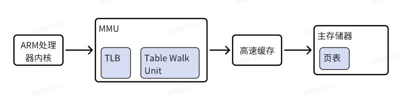 ARM处理器内核的MMU单元包括TLB和页表遍历单元(Table Walk Unit)两个部件。TLB是一个高速缓存,用于缓存页表转换结果,从而减少页表查询时间。一个完整的页表翻译和查找的过程叫做页表查询。页表查询过程由硬件自动完成,但是页表的维护需要由软件来完成。页表查询是个较耗时的过程,理想状态下TLB中应存有页表相关信息,TLB未命中时,MMU才会查询页表,从而得到翻译后的物理地址。页表存储在主存储器中。先访问TLB,若未命中再访问主存储器。