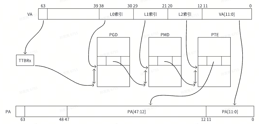 对于39bit-VA + 48bit-PA 的三级页表映射, 如下图: