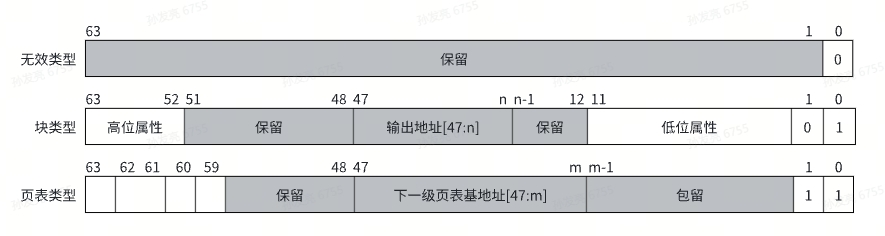 当Bit[0]为1时是有效页表项,为0时是无效页表项。Bit[1]为1时表示页表类型页表项,为0时表示保留页表项。