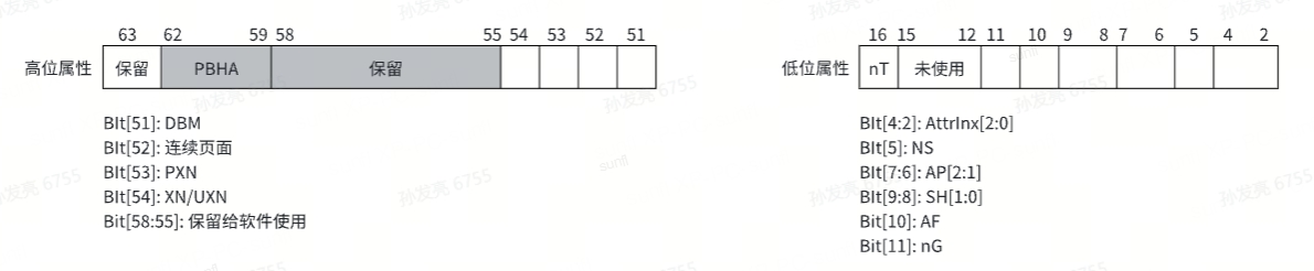 Bit[11:2]是低位属性,Bit[63:51]是高位属性,属性含义如下: