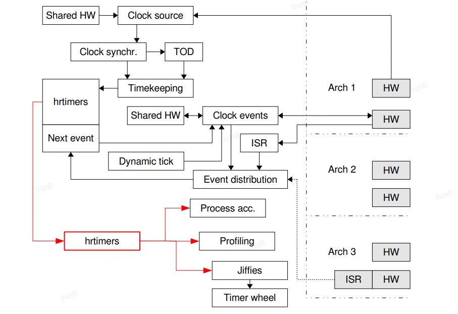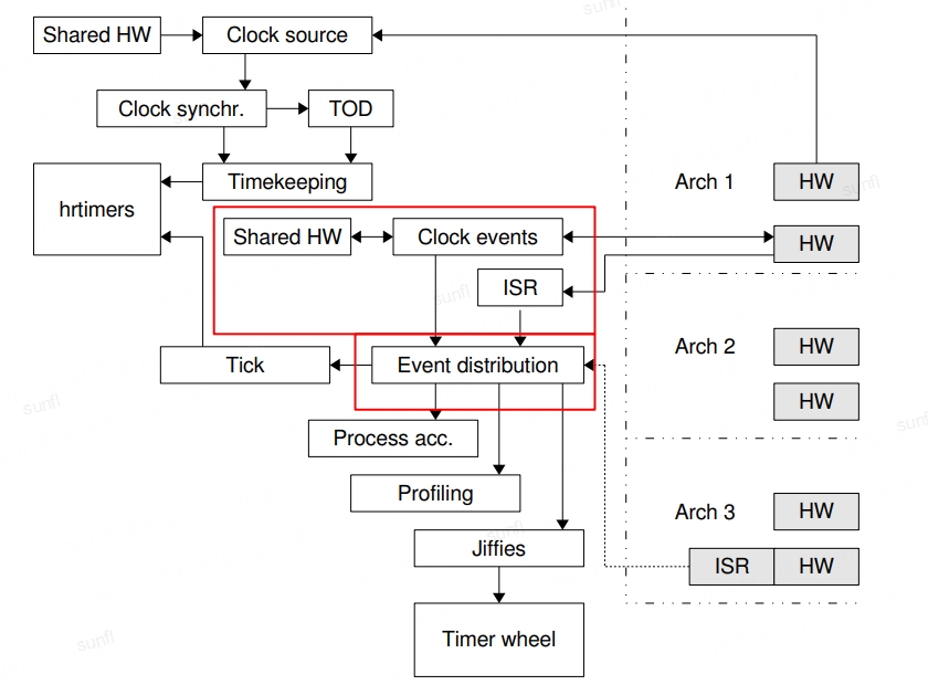 时钟事件子系统试图通过提供通用解决方案来管理时钟事件设备及其在各种时钟事件驱动内核功能中的使用,从而解决这个问题。时钟事件子系统的目标是将与时钟事件相关的、依赖于架构的代码最小化,只保留纯硬件相关的处理,并允许轻松添加和使用新的时钟事件设备。它还最大限度地减少了跨架构的重复代码,因为它提供了通用功能,直至几乎本质上依赖于硬件的中断服务处理程序。