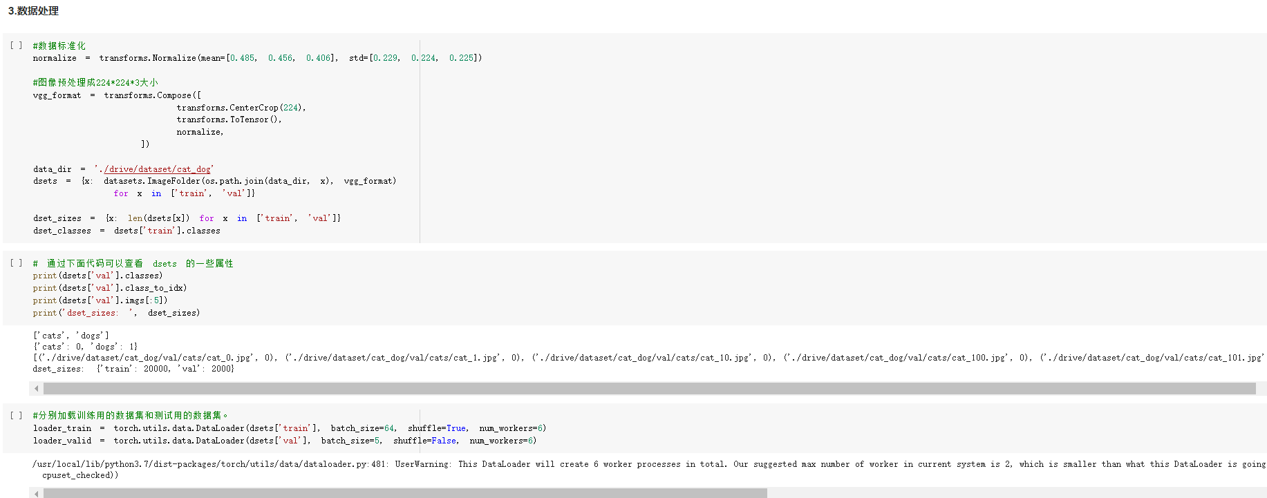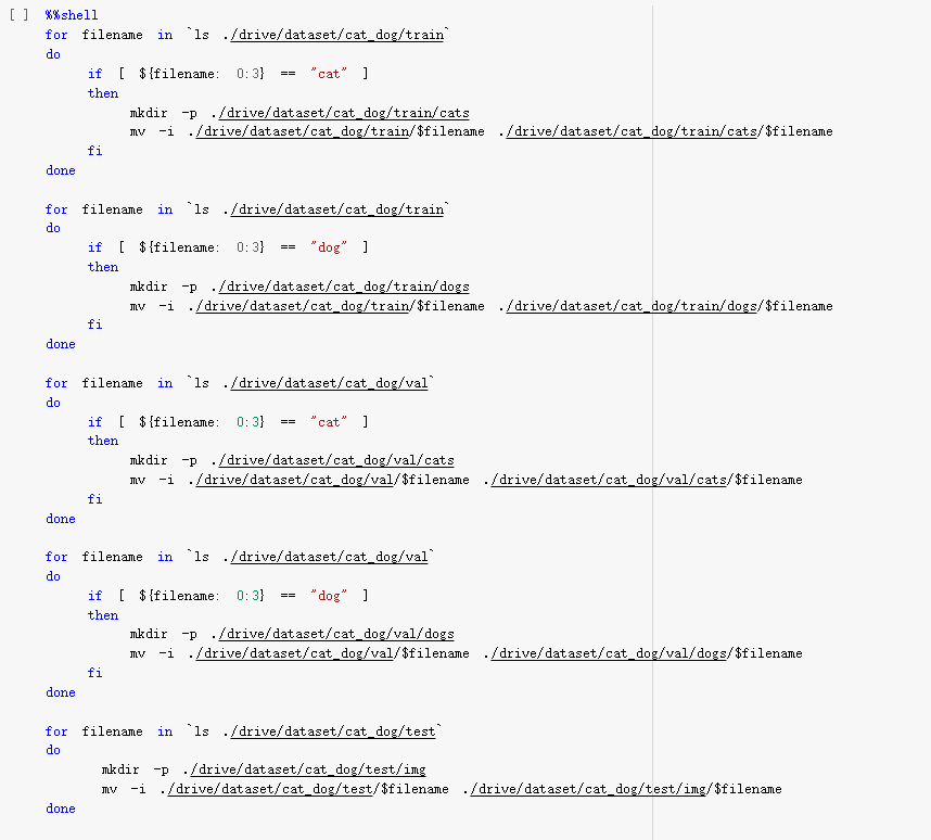 下面代码更改了压缩之后的目录结构,在train和val中分别添加了文件夹cats和dogs,并把猫和狗的图片分类分别放入两个文件夹中。