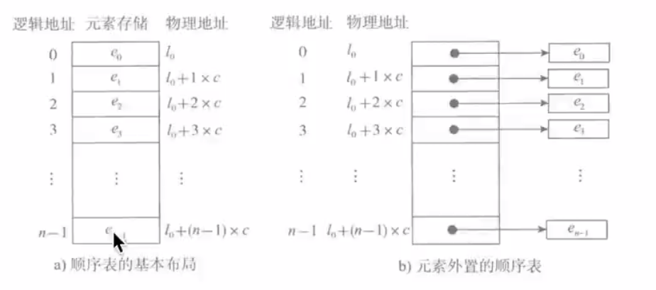 - 如果元素的大小不统一,则需要采取元素外置的形式,将实际数据元素另行存储,而顺序表中各单元位置保存对应元素的地址信息(即链接)。由于每个链接所需的存储量相同,通过上述公式,可以计算出链接的存储位置,而后顺着链接找到实际存储的数据元素。图b这样的顺序表也称为对实际数据的索引,这是最简单的索引结构。