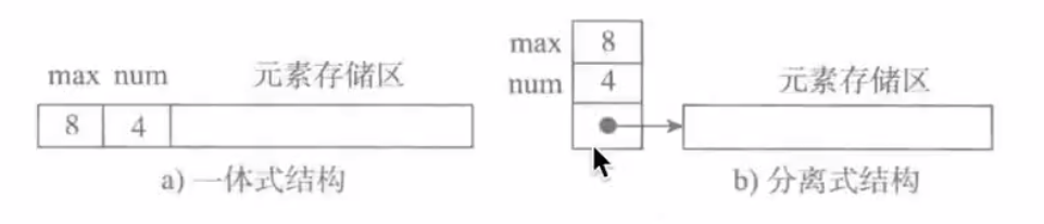 分离式结构:表对象里只保存与整个表有关的信息(即容量和元素个数),实际数据元素存放在另一个独立的元素存储区里,通过链接与基本表对象关联。