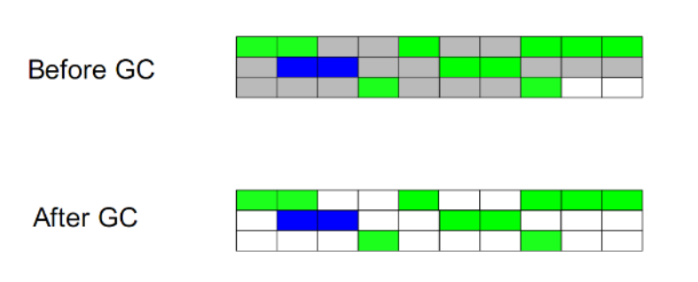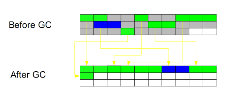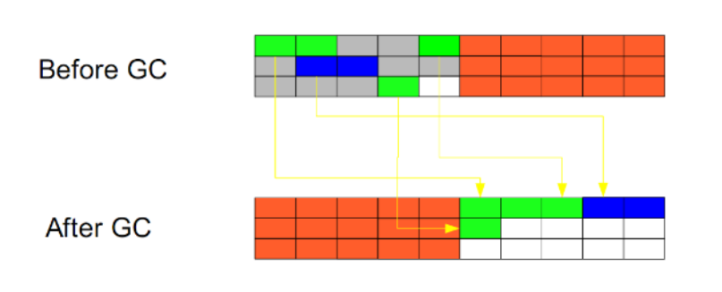 标记压缩(Mark-Compact): 没有碎片 效率偏低(两边扫描,指针需要调整)