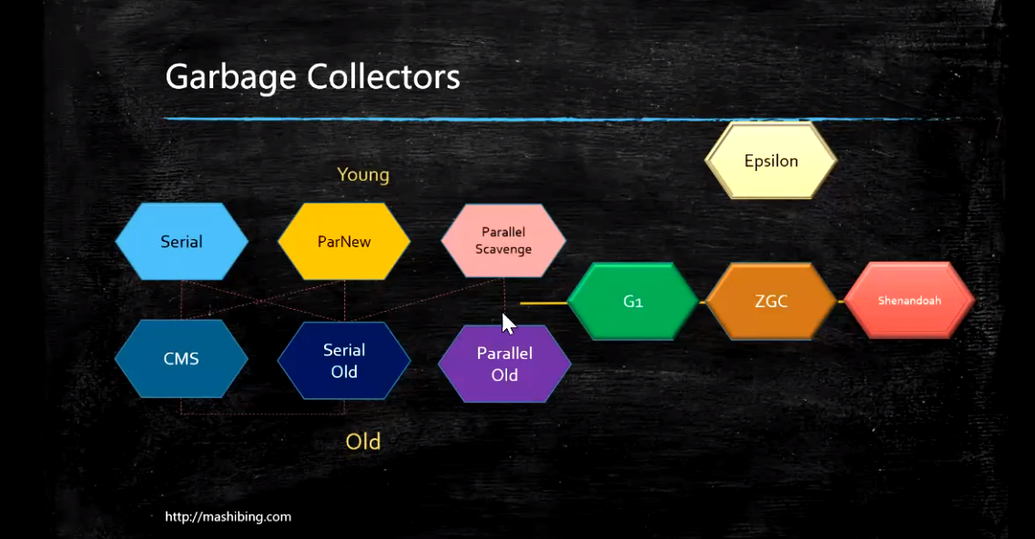 注解:JDK诞生的时候,Serial就追随了。为了提高效率,诞生了PS,为了配合CMS,就诞生了PN,CMS是1.4版本后期引入,CMS是里程碑式的GC,它开启了并发回收的过程,但是CMS毛病也比较多,因此目前任何一个JDK版本默认是CMS。