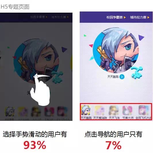 下例H5专题页面,用户可以手势滑动切换游戏,也可以点击下面的导航切换游戏。93%的用户选择手势滑动,只有7%的用户选择点击导航。