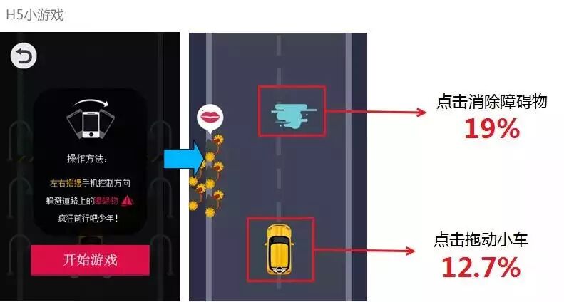 下例的H5小游戏开始前有操作方法提示,玩法是晃动手机(像控制真车方向盘一样)控制小车左右移动躲避障碍物。但是有19%的用户选择点击消除障碍物,12.7%的用户选择点击拖动小车,直接忽略教程。