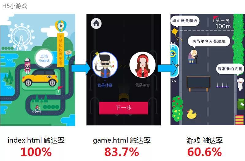 跟PC情况相似,用户触达率随着页面层级加深而减小。下例的H5小游戏里,用户先进入一个地图首页,点击“开始游戏”会跳转到游戏页面,再进行性别选择和操作提示,最后才到达游戏。每一步的操作都有部分用户流失。