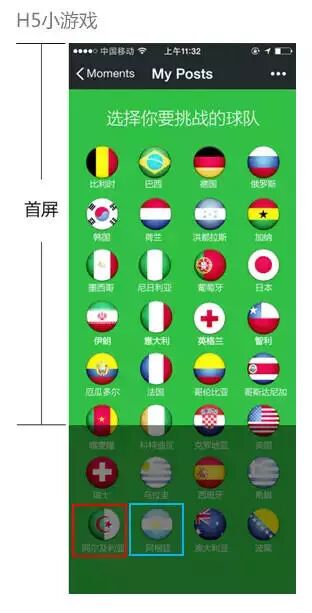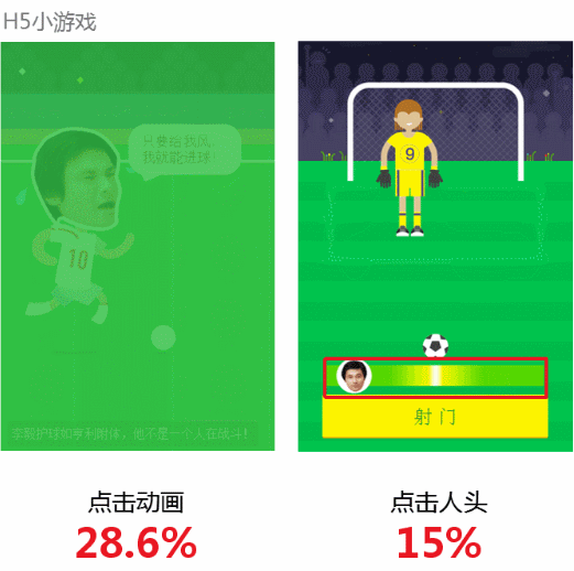 下例H5小游戏在开始前会进行一段动画,部分用户在动画过程中就开始点击页面。右图是游戏界面,点击“射门”按钮射门,但是有15%的用户会先点击移动的人头(好有趣啊- -//)。