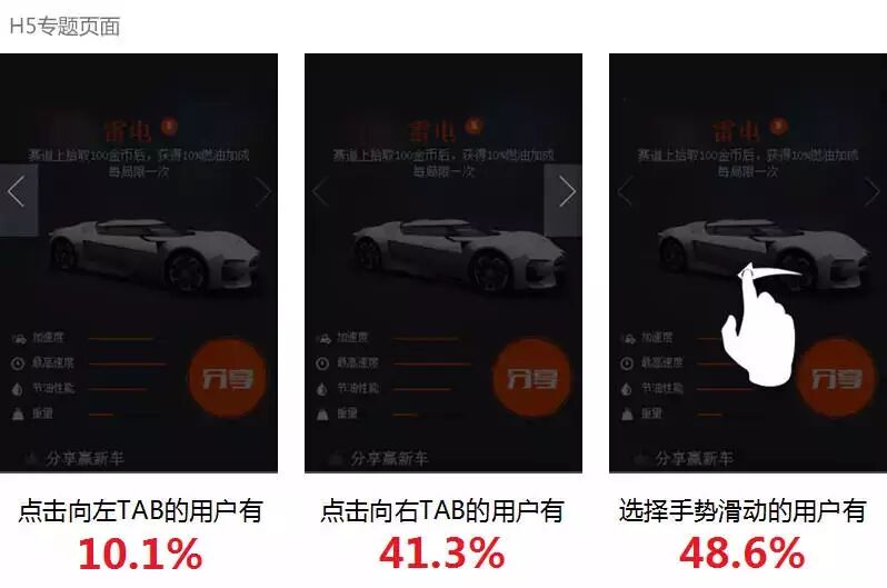 下例H5专题页面,用户可以点击左右按钮或者手势滑动来360°查看新车。所有手势中,左点击只有10.1%,右点击有41.3%,手势滑动占48.6%。