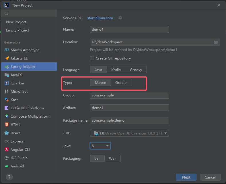 1、点击 Spring Initializr , 选择 JDK 版本 ,选择 Default ,选择Type(Maven),点击 Next;