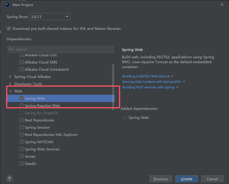 2、选择 Web 依赖 和 Spring Boot 版本号,点击 Next;