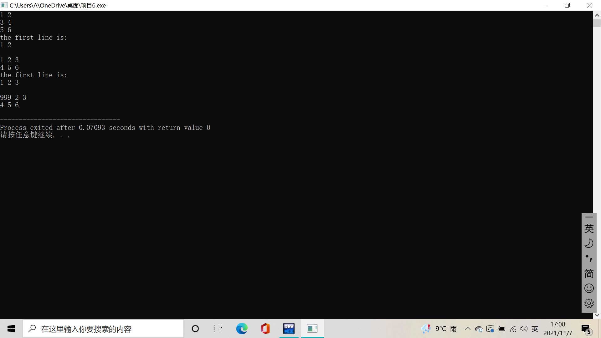 #include <iostream> #include "matrix.hpp" int main() { using namespace std; double x[] = {1, 2, 3, 4, 5, 6}; Matrix m1(3, 2); // 创建一个3×2的矩阵 m1.set(x); // 用一维数组x的值按行为矩阵m1赋值 m1.print(); // 打印矩阵m1的值 cout << "the first line is: " << endl; cout << m1.at(0, 0) << " " << m1.at(0, 1) << endl; // 输出矩阵m1第1行两个元素的值 cout << endl; Matrix m2(2, 3); m2.set(x); m2.print(); cout << "the first line is: " << endl; cout << m2.at(0, 0) << " " << m2.at(0, 1) << " " << m2.at(0, 2) << endl; cout << endl; Matrix m3(m2); // 用矩阵m2构造新的矩阵m3 m3.set(0, 0, 999); // 将矩阵m3第0行第0列元素值设为999 m3.print(); }