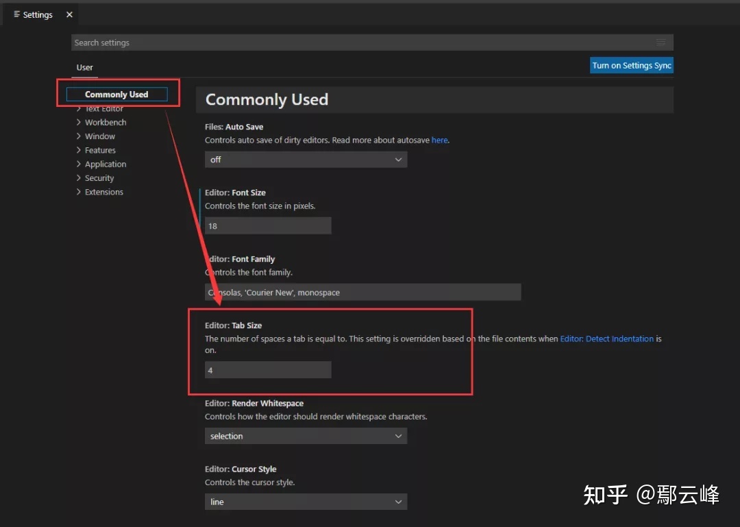 通过设置菜单 或者 快捷键 【Ctrl+,】 打开 Vs Code 的设置面板,将通用设置【Commonly Used】中的 【Tab Size】改为:4