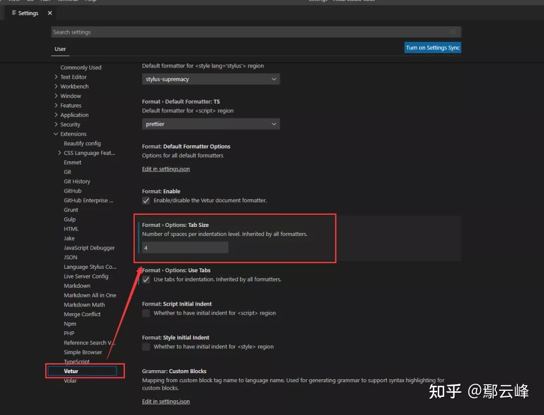 如果你使用的是Vue开发框架,并且你使用的是 【Vetur】插件,那么在设置中找到插件【Vetur】,并把它的 【Tab Size】 改为:4