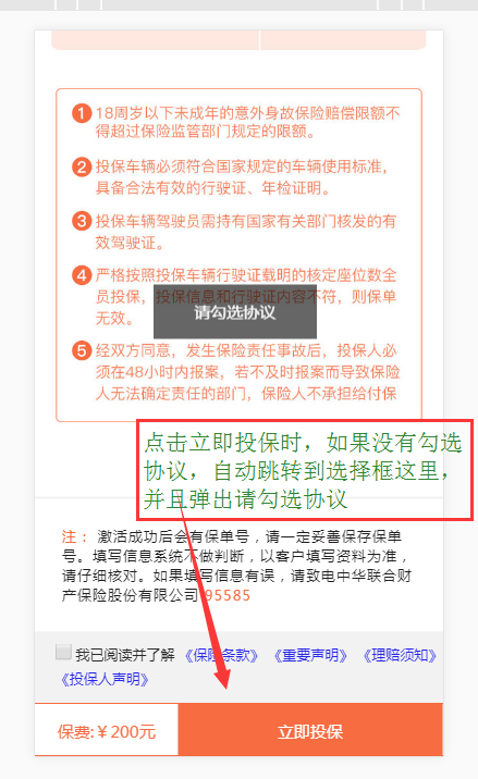 .需求:1点击立即投保时;如果客户没有勾选协议,自动跳转到