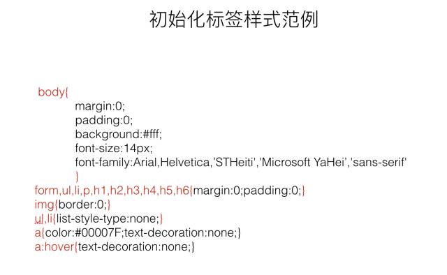 标签样式初始化的实质其实就是让我们自己亲自为标签制定默认样式,覆盖那些浏览器自作主张或者是不和谐的部分,也就是我们自己掌握全盘的权利。