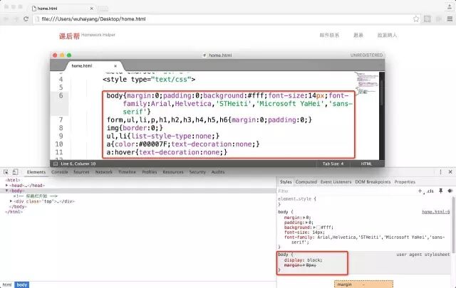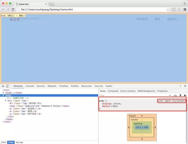 此时其实我们已经锁定问题了,就是这块! 但是这个我们并没有给body设定margin, 既然我们什么都没有做,到底是谁给body制定的这个样式呢? 也正因为是这个设定,让我们的上部留白多了8像素。那到底是谁干的这个事。