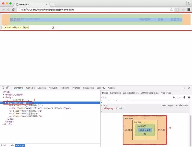当我们对当前效果进行检查的时候,看数字1的位置,我们将鼠标放到数字1的div上,此时就会产生数字的效果。数字2中包含几个颜色分布,首先就是两边的浅黄色,这两边的浅黄色其实就是左右margin,其实是中间的浅绿色,这块浅绿色实际上就是我们为div设定的宽度,最后我们看浅蓝色的部分,其实就是我们的内容区域了。