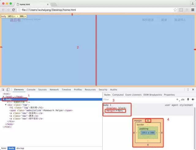 我们继续看数字3的位置,这个地方有一个margin:8像素,这代表的是给body的上下左右都加了一个8像素的边距。