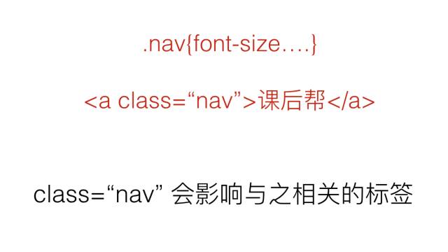 我们首先在style样式中写了一个.nav样式,然后我们给某个标签指定了class="nav",此时这个标签就有了nav的样式,也就是说这个nav影响了与之相关的标签。