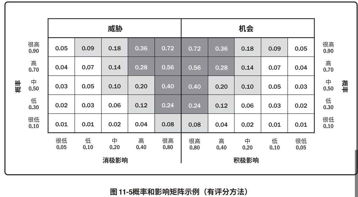 图 11-5 是概率和影响矩阵的示例,其中也有数值风险评分的方法。