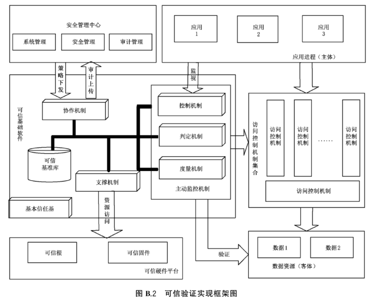 可信验证是基于可信根,构建信任链,一级度量一级,一级信任一级,把信任关系扩大到整个计算节点,从而确保计算节点可信的过程,可信验证实现框架如图B.2 所示。