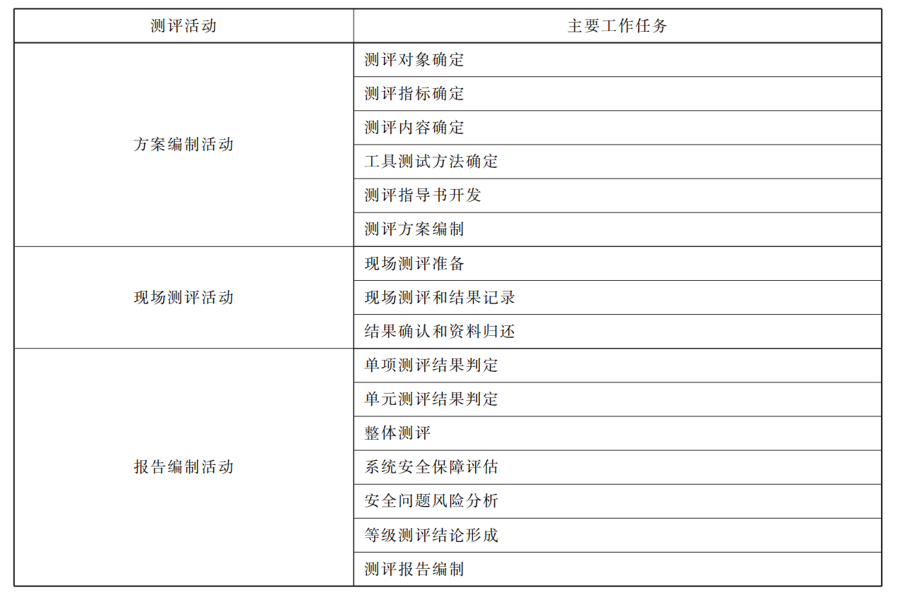 - 包含测评对象确定、测评指标确定、测评内容确定、工具测试方法确定、测评指导书开发及测评方案编制六项主要任务