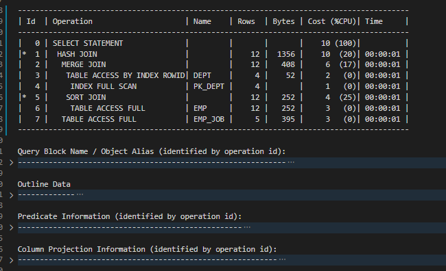3 - SEL$1 / DEPT@SEL$1 --DEPT@SEL$1,对应到执行计划中的操作ID为3上,即在表DEPT上的查询,DEPT为别名,下面类同