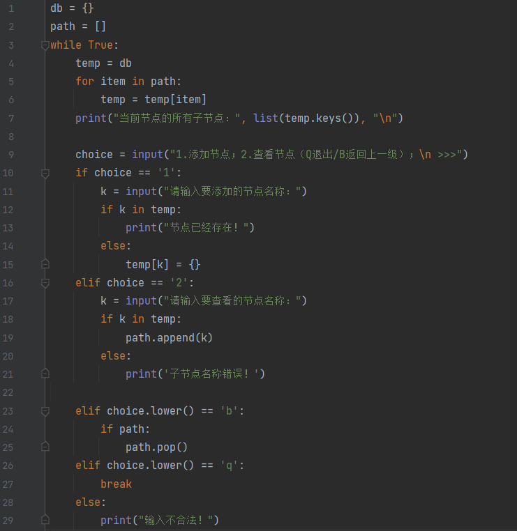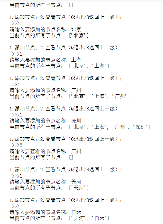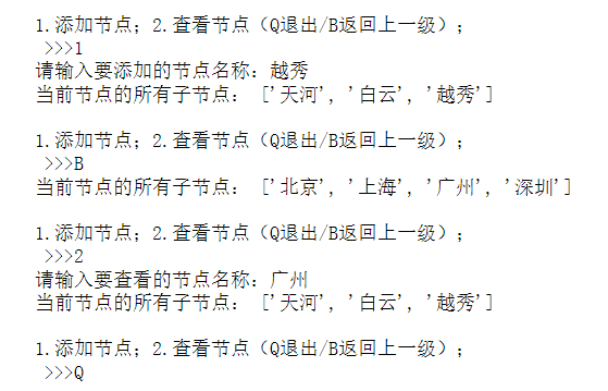 db={} path=[] while True: temp=db for item in path: temp = temp[item] print("当前节点的所有子节点:",list(temp.keys()),"\n") choice = input("1.添加节点;2.查看节点(Q退出/B返回上一级);\n >>>") if choice == '1': k = input("请输入要添加的节点名称:") if k in temp: print("节点已经存在!") else: temp[k] = {} elif choice == '2': k = input("请输入要查看的节点名称:") if k in temp: path.append(k) else: print('子节点名称错误!') elif choice.lower() == 'b': if path: path.pop() elif choice.lower() == 'q': break else: print("输入不合法!")