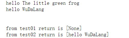 def test01(): msg='hello The little green frog' print(msg) def test02(): msg='hello WuDaLang' print(msg) return msg t1=test01() t2=test02() print("\n") print ('from test01 return is [%s]' % t1) print ('from test02 return is [%s]' % t2)