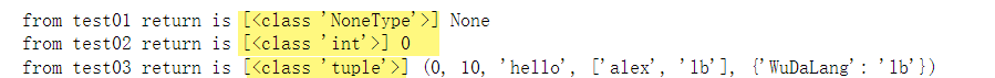 def test01(): pass def test02(): return 0 def test03(): return 0,10,'hello',['alex','lb'],{'WuDaLang':'lb'} t1=test01() t2=test02() t3=test03() print("\n") print ('from test01 return is [%s]' % type(t1),t1) print ('from test02 return is [%s]' % type(t2),t2) print ('from test03 return is [%s]' % type(t3),t3)