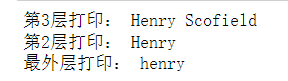 name = "henry" def change_name(): name = "Henry" def change_name2(): name = "Henry Scofield" print("第3层打印:",name) change_name2() # 调用内层函数 print("第2层打印:",name) change_name() print("最外层打印:",name)