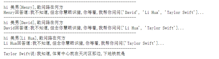 1 import time 2 3 person_list=['Henry','David','Li Hua','Taylor Swift'] 4 def ask_way(person_list): 5 print('-'*60) 6 if len(person_list) == 0: 7 return '没人知道' 8 person = person_list.pop(0) 9 if person == 'Taylor Swift': 10 return '%s说:我知道,体育中心就在天河区那边,下地铁就是' % person 11 print('hi 美男[%s],敢问路在何方' %person) 12 print('%s回答道:我不知道,但念你慧眼识猪,你等着,我帮你问问%s...' %(person,person_list)) 13 time.sleep(3) 14 res=ask_way(person_list) 15 # print('%s问的结果是: %res' %(person,res)) 16 return res 17 18 19 20 res=ask_way(person_list) 21 22 print(res)