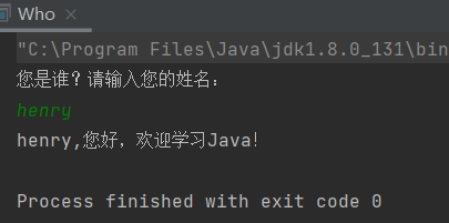 1 package ch01; 2 import java.util.Scanner; 3 public class Who { 4 public static void main(String[] args) { 5 Scanner sc = new Scanner(System.in); 6 System.out.println("您是谁?请输入您的姓名:"); 7 String str =sc.nextLine(); 8 System.out.println(str + ",您好,欢迎学习Java!"); 9 sc.close(); 10 } 11 }